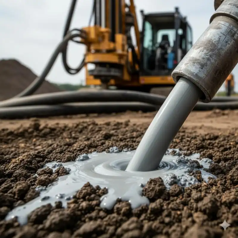 Na injeção de consolidação de solos, um material específico, como calda de cimento, microcimento ou produtos químicos, é injetado no subsolo.